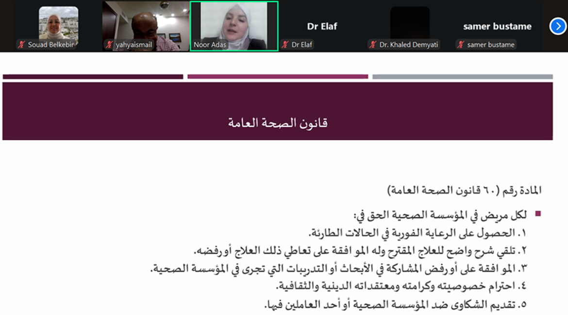 نظّمت وحدةُ التعليم الطبي والتطوير المهني وتقييم الموظفين في كلية الطب البشري والعلوم الطبية المساندة، لقاءً تدريبياً يوم الثلاثاء-11/11/2025، عند الساعة السادسة مساءً عبر منصة زووم، حيث تم استضافة د.نور عدس، عميدة كلية القانون والعلوم السياسية، للحديث حول الأخلاقيات والقوانين في الممارسات الطبية.