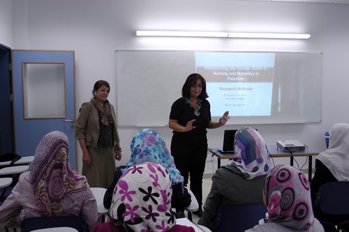 ثم قامت د. كارمن باعطاء محاضرة بعنوان "كيفية البحث في اسباب الفجوة ما بين الجنسين بالالتحاق في برامج التمريض والقبالة في فلسطين" لطلاب تمريض وقبالة سنة رابعة، وحضر المحاضرة بالاضافة الى الطلبة الهيئة التدريسية كل من أ. مهدية الكوني، أ. سماح اشتية، أ. فاطمة حرز الله، أ. نزار سعيد، وخلال المحاضرة تناولت د. كارمين طرق البحث العلمي وتطرقت الى استخدام المجموعات خلال البحث العلمي، وفي نهاية المحاضرة شكرت د. عائدة القيسي د. كارمن على المحاضرة القيمة وتطلعت الى مزيد من التعاون.