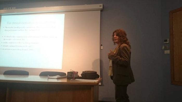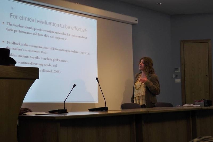 في البداية ناقشت د.القيسي رؤية وفلسفة دائرة التمريض والقبالة والمعايير التي يجب ان تتوفر في طلبة التمريض و القبالة خلال التدريب السريري والمهارات التي يجب ان يكتسبها الطالب خلال التدريب من خلال المعرفة والمهارات التي ينقلها المدرب اليه ايضا نوهت الدكتورة عائدة الى اهمية تحديد المهام والمسؤوليات للمدرب السريري حيث يجب العمل على تدريب الطلبة حسب البرنامج التدريبي وتطوير المواد التدريبية بالتنسيق مع مسؤول المساق/ الشق النظري، وتحديد الأولويات للتعليم والتدريب حسب الإحتياجات التعليمية والتدريبية والتي تتضمن برنامج التدريب، خطط التقويم والمواد التعليمية ومنهجية التعامل مع المرضى والأهل والكادر التمريضي والطبي وتقييم الأداء للطلبة والإحتفاظ بملفات نشاطات التدريب والتعليم (portfolio)الذي يقوم الطالب بتنفيذها والإلتزام بدليل الإجراءات التمريضية المبنيه على الممارسه القائمه على الأدلة العلمية . كما قامت أ. شروق قادوس بمناقشة صفات المدرب الناجح ودوره ومسوؤلياته في التدريب العملي و ايضا دور الطالب خلال التدريب العملي . أما الاستاذة مهدية الكوني فقد ناقشت على أهمية الاتصال و التواصل بين المدرب و الطالب وبين طاقم التمريض في المستشفى وبين المرضى و المعيقات التي قد تواجه المدرب خلال التدريب في التواصل مع الطلبة وخطوات حل مثل هذه العقبات . كما تحدثت د.ايمان الشاويش عن صدمة الواقع عند الطالب عند شروعه بالتدريب و خاصة في اول تدريب له حيث قامت بتعريف صدمة الواقع ومراحلها والاستراتيجيات القائمة لتفادي صدمة الواقع عند الطالب. أما أ. سماح اشتية فقد ناقشت الصراع الذي قد ينشأ خلال التدريب بين المدرب و الطالب أو بين طاقم التمريض و الطرق الصحيحة لحل مثل هذه المشكلات . أما معايير التقييم و الهدف من التقييم فقد ناقشه د. جمال القدومي بمحاضرته حيث تطرق الى اهمية تقييم الطالب بطريقة شمولية وبمحاور عديدة وايضاح نقاط الضعف عند الطالب وكيفية معالجتها . كما قام أ. عمر المحمود بعرض احصائيات قام بتحليلها من خلال نموذج لتقييم المدربين من قبل الطلبة في نهاية كل تدريب عملي .