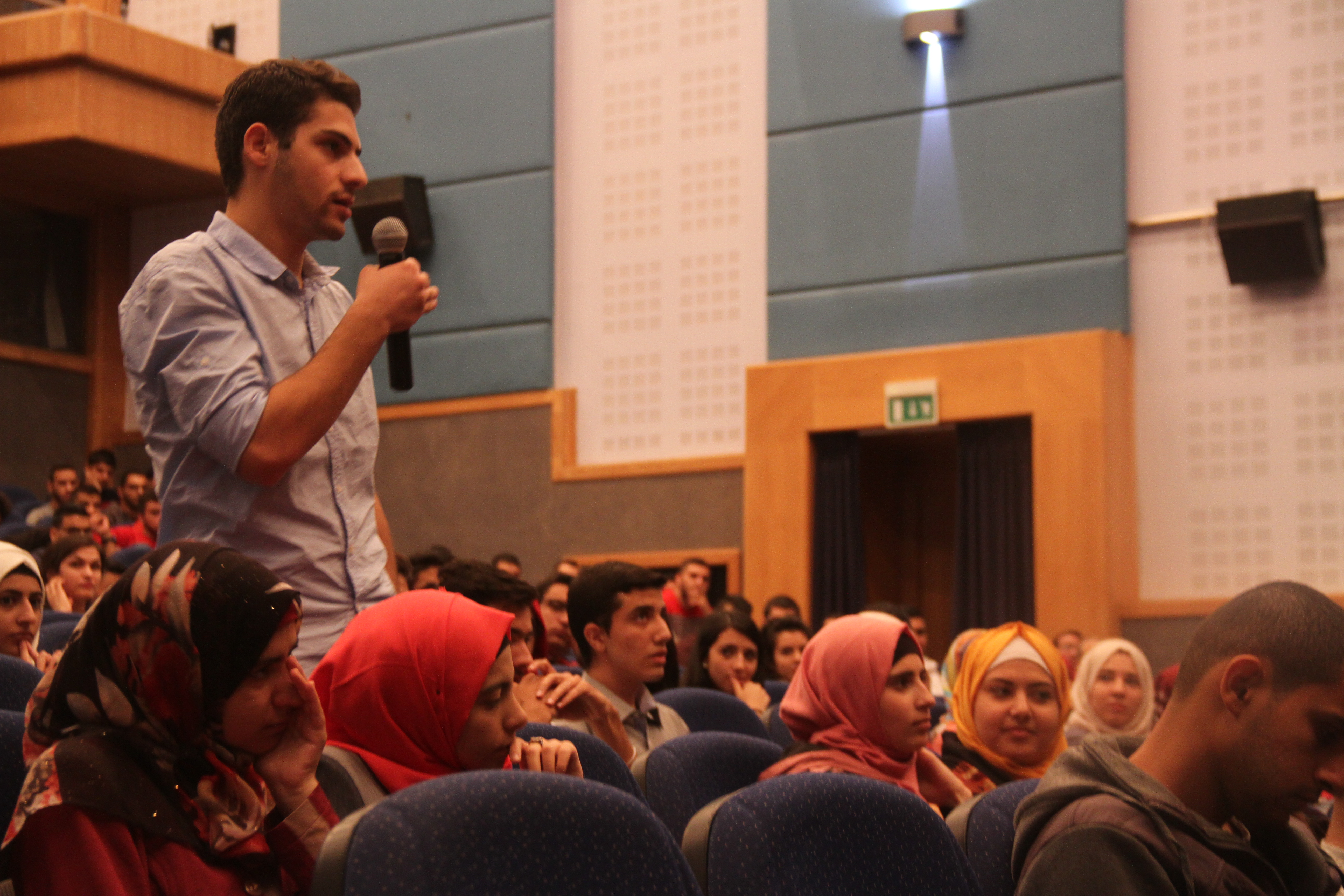 وفي معرض إجابته حول تساؤلات الطلبة أكد البروفيسور على أن كلية الطب وعلوم الصحة تسعى لاعتماد المعايير العالمية لامتحانات الكلية، مثل اعتماد امتحان IFOM وتابع البروفسور موضحا للطلبة أنهم مقبلون على مرحلة التدريب السريري، حيث تحرص الكلية على استقبال أكبر عدد ممكن من الطلبة في المستشفيات، ومن خلال التوسعة التي يقوم بها المستشفى الجامعي، ليصبح المستشفى الجامعي الأكبر في المنطقة بحيث يستطيع تدريبكم ولكن أكد البروفيسور على أهمية الاستمرار في التعاون وعدم الاستغناء عن المشافي الحكومية كاستراتيجية مهمة ومبدئية في التعليم.