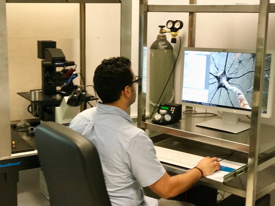 ويوضح الدكتور قنيبي أن مختبر الأعصاب يتكون بصورة رئيسية من جهاز "فحص التيار الكهربائي للخلايا العصبية"، وهو جهاز يدرس الخلايا العصبية كل خلية على حدة وبمتغير واحد فقط، وهو الأمر الذي يشكل تطوراً كبيراً من الناحية العلمية في مجال الخلايا العصبية.