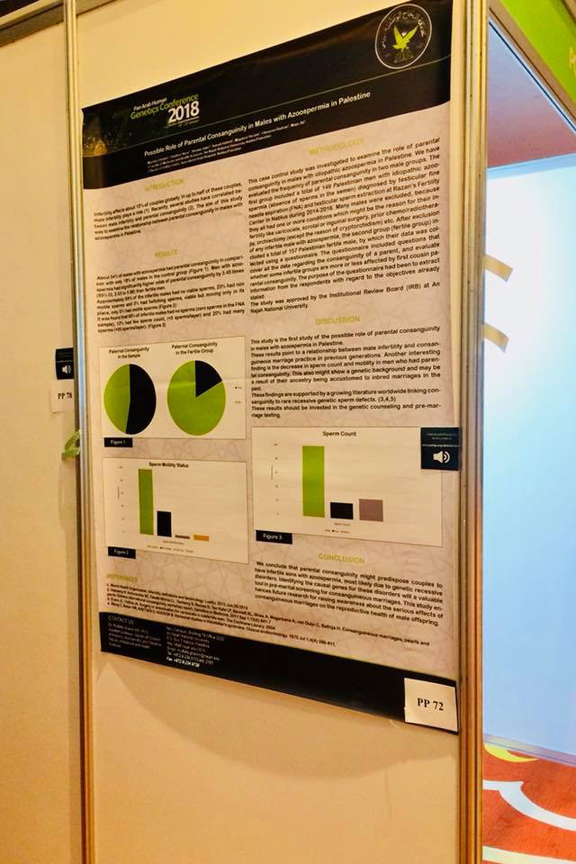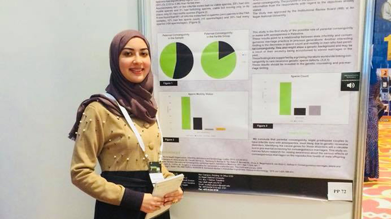 قدّمت الطالبة غدير الهوس، سنة سادسة في دائرة الطب البشري في كلية الطب وعلوم الصحة في جامعة النجاح، نتائج مشروع التخرج الذي يجمعها مع زميلتيها الطالبتين في الكلية ديمة جبروميس علي في المؤتمر الدولي السابع لعلم الوراثة الإنساني والذي عُقد في دبي في الفترة ما بين 18-20/1/2018.